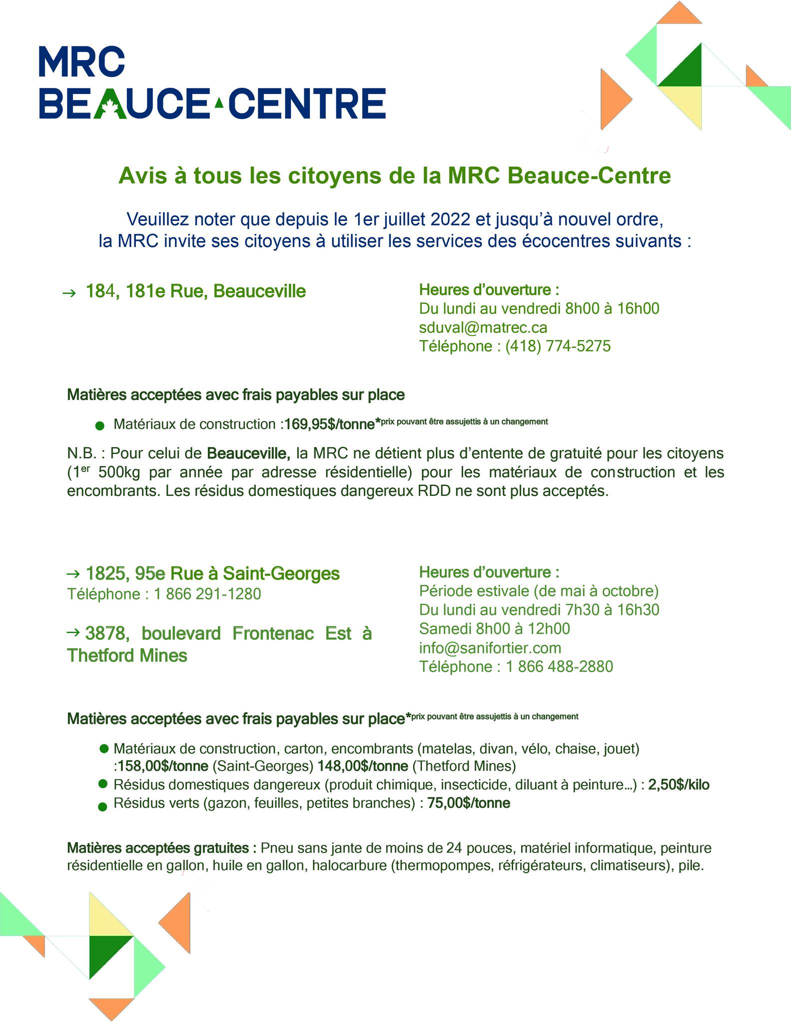 ÉCO-CENTRES : Deux nouveaux Éco-centres ouvriront en mai soit à Saint-Victor et à Saint-Odilon! Surveillez l'information à venir prochainement.